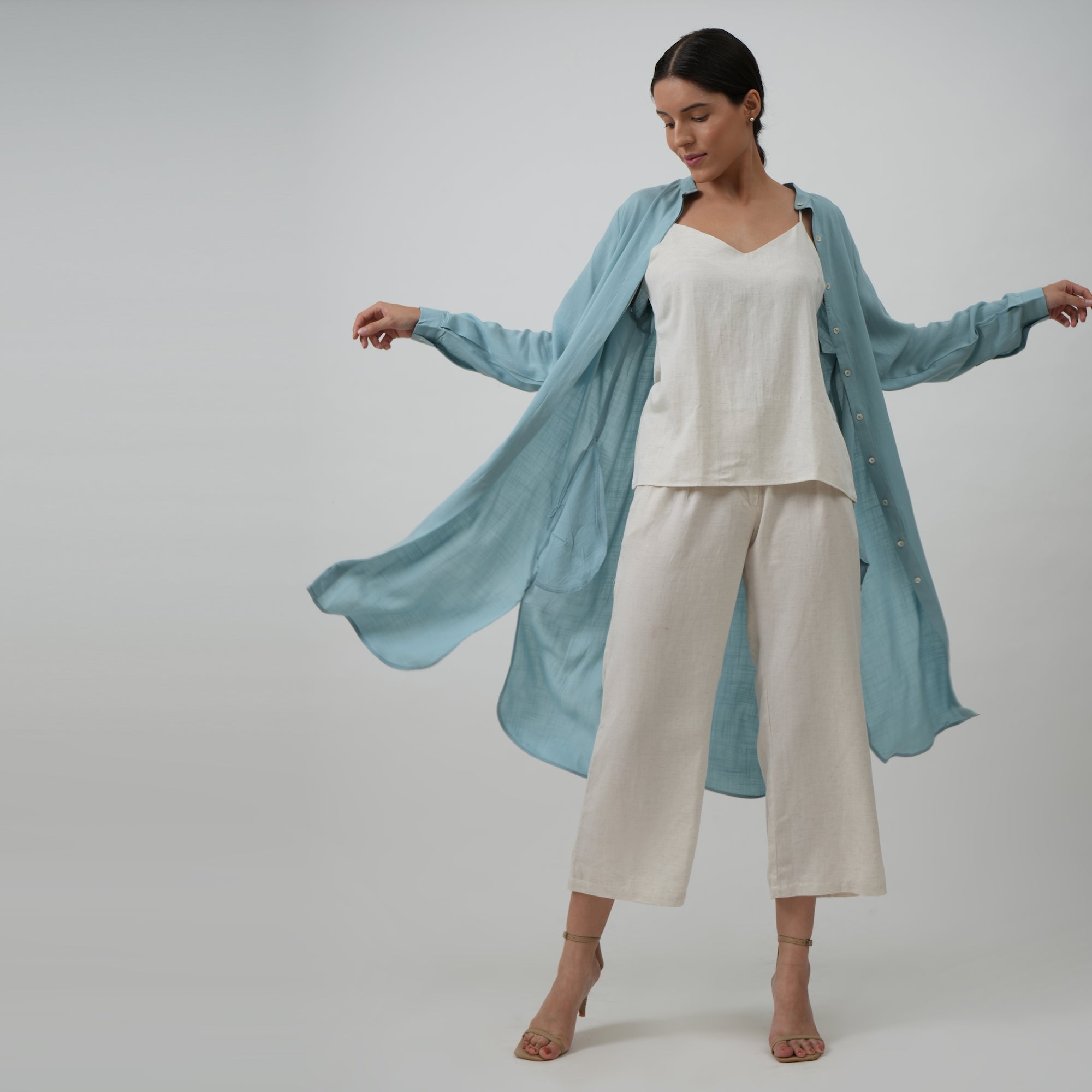 >The overlay is made from light-weight soft and breathable 100% organic textured cotton slub fabric & both the slip top & pants are made from soft & breathable blend of cotton, tencel & hemp fabric.