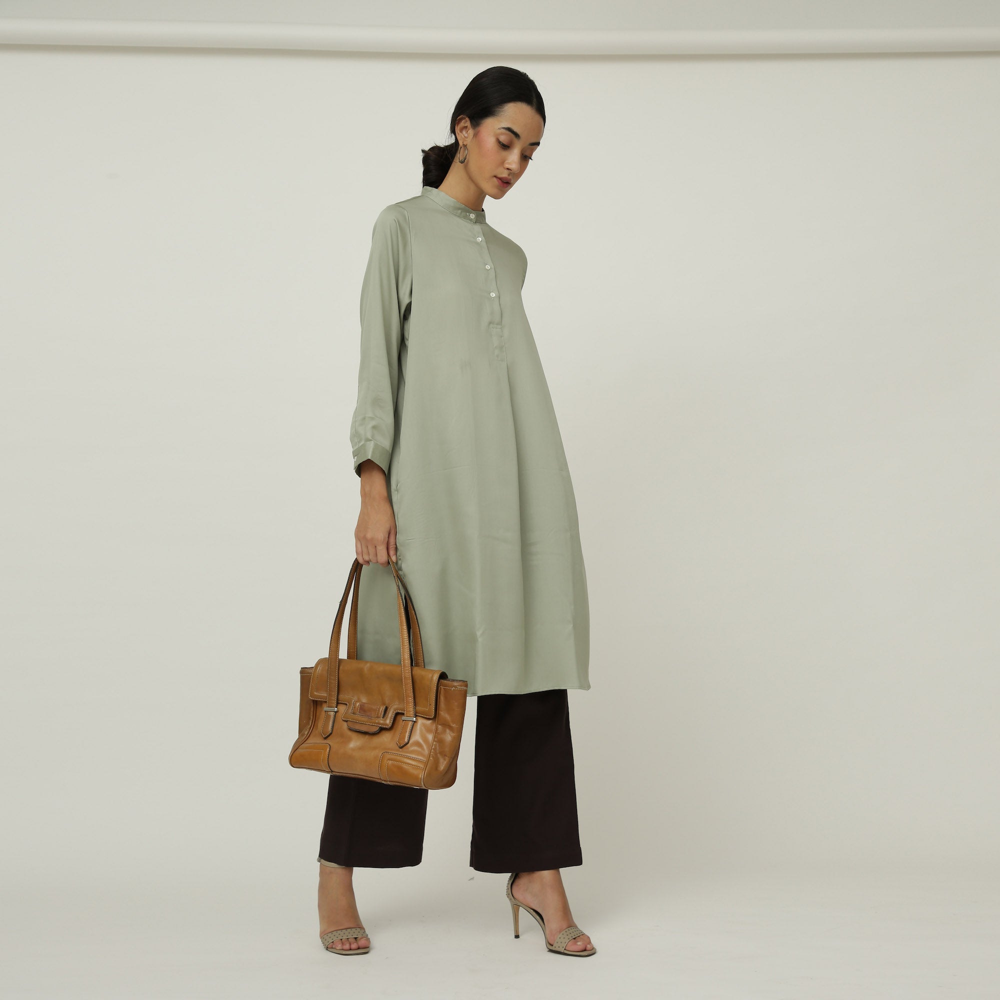 > Close mandarin neck with front buttons.