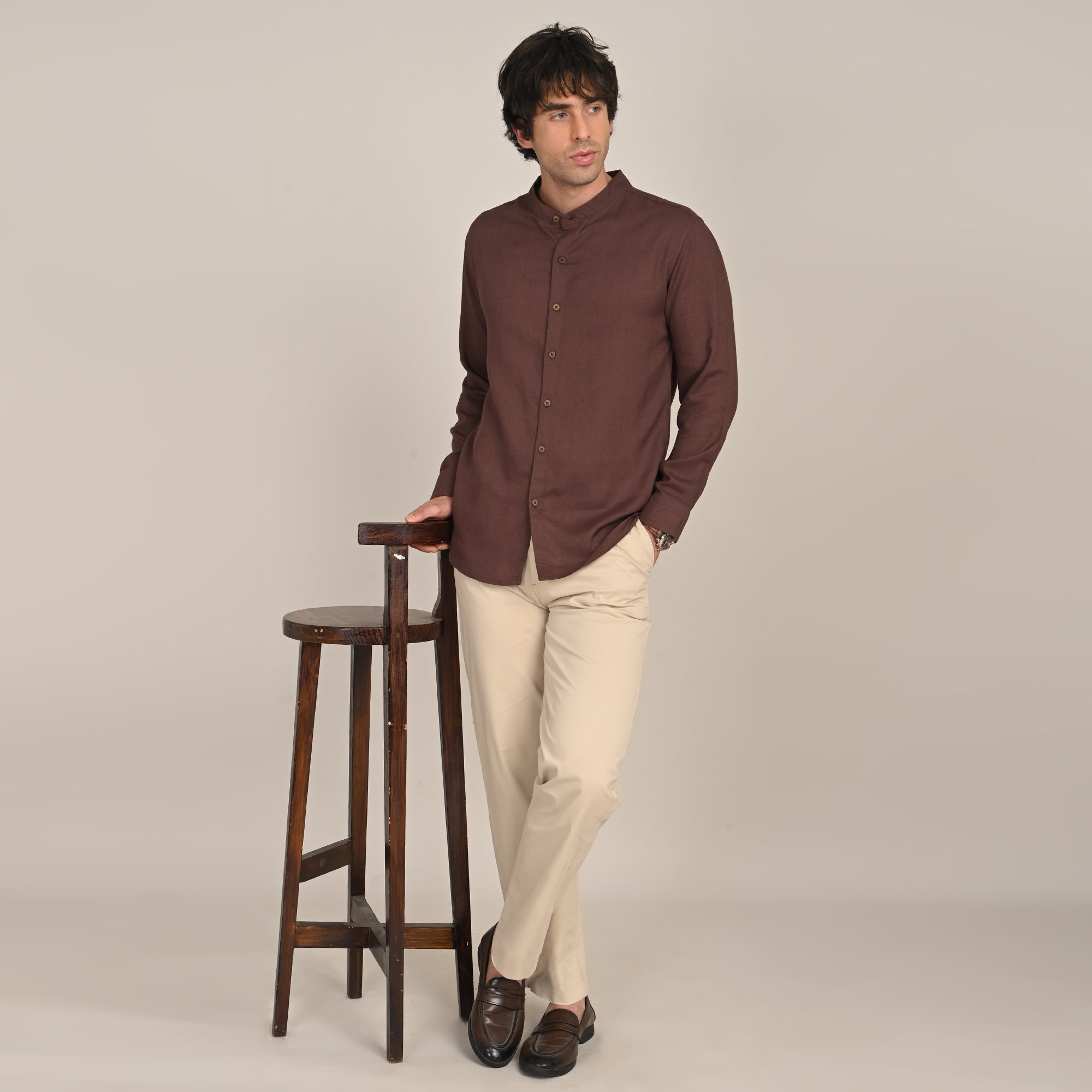 Refine your everyday look in this relaxed fit full sleeve shirt with mandarin collar. Designed to offer a balance of sophistication and casual comfort.