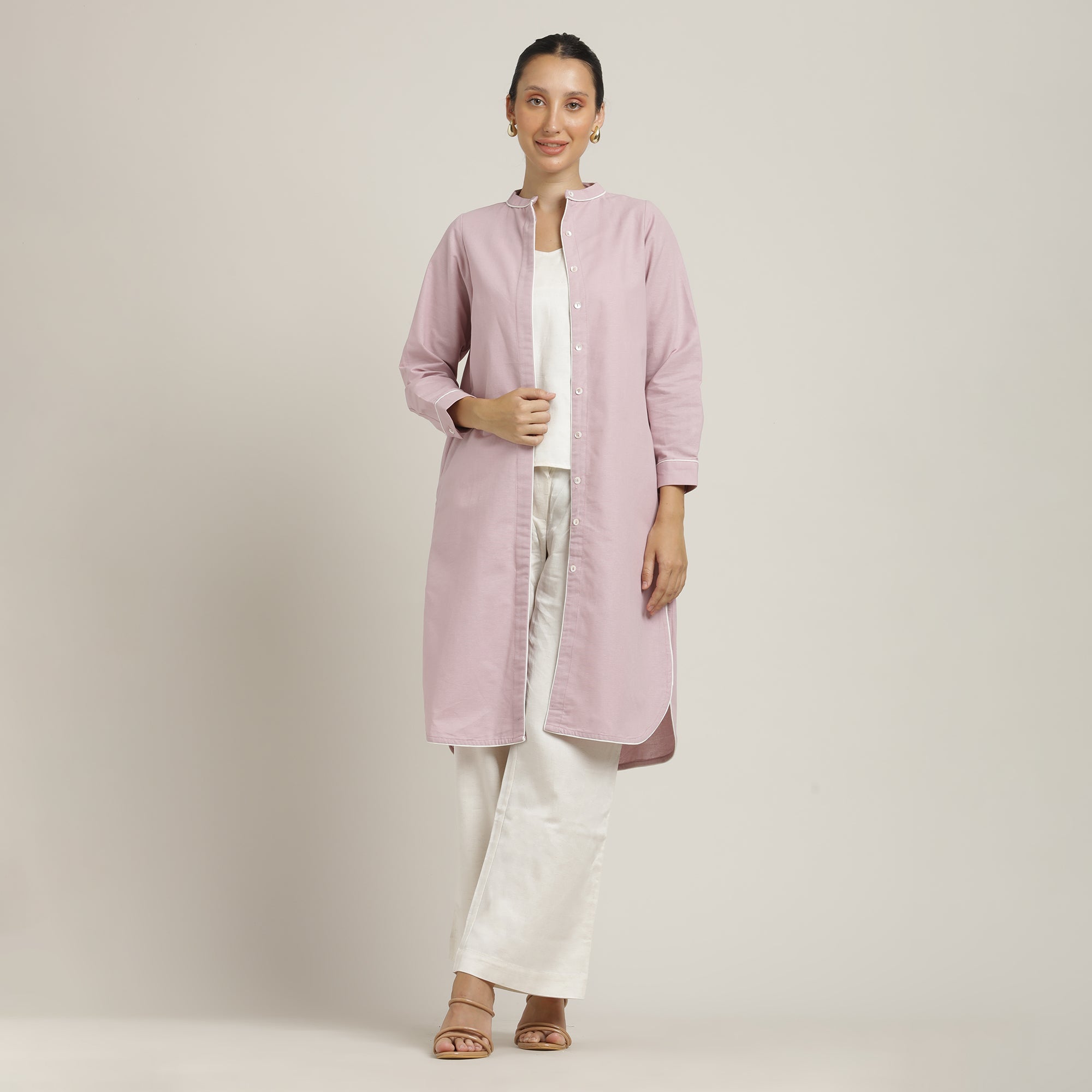 > Comfortable mandarin neck with front buttons, full sleeves and side slits
