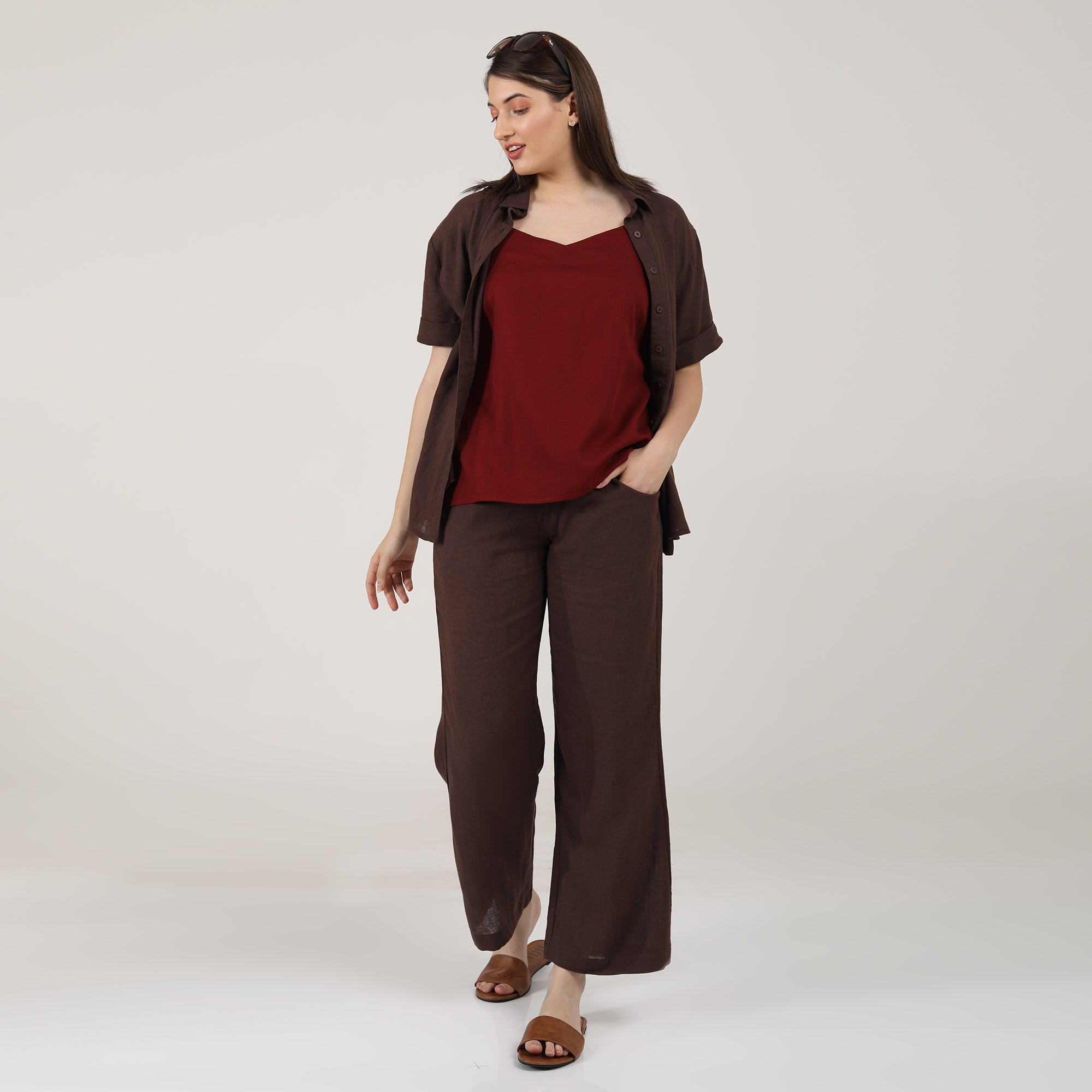 >Shirt and pants are made from softly textured linen fabric and the slip top is made from soft & breathable blend of cotton, tencel & hemp fabric