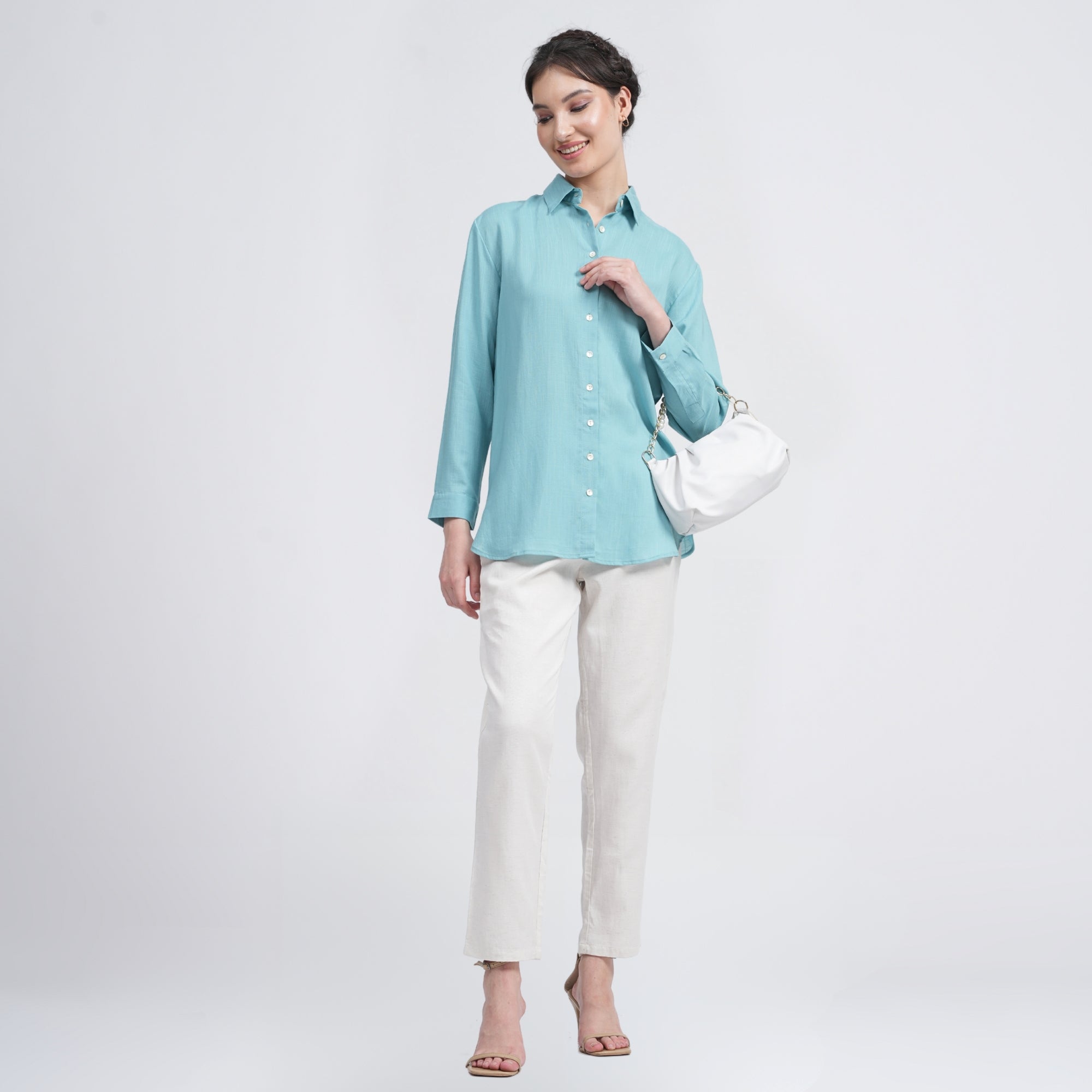 A relaxed button down shirt with tapered pants.